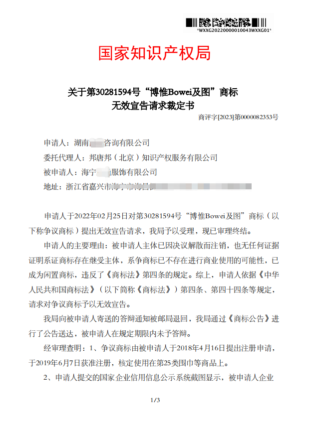 我司受湖南某咨询有限公司委托,针对第30281594号“博惟Bowei及图”商标提出无效宣告请求,经我司严