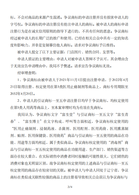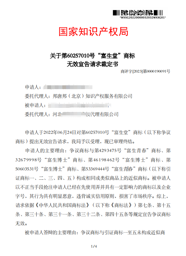 我司受申请人委托,向国家知识产权局商标局对第60257010号“富生堂”商标(下称争议商标)提出无效宣告请求。
